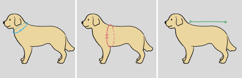 강아지 목둘레, 가슴둘레 그리고 등길이를 체크해 주세요. 그리고 옷을 고를 땐 목둘레와 가슴둘레가 실제 사이즈보다 약간 큰 제품을 고르는 게 편안하게 입히기 좋습니다. 등길이의 경우 조금 짧아도 괜찮은데요. 만약 보온이 목적이라면 최대한 등 길이와 맞춰서 구매하는 게 좋답니다.