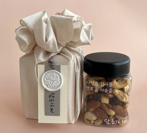 최상 품질의 견과류만 모아 담은 고급 견과류. 아몬드, 캐슈넛, 호두, 마카다미아, 브라질넛, 건블루베리 등 맛과 건강을 모두 만족시킬 구성을 합리적인 가격으로 선보인다. 결혼식, 돌잔치, 조문, 개업 등 모든 순간에 알맞게 포장해주며, 보자기와 잘 어울리는 실링왁스와 꼰세사를 이용해 택을 마무리한다.
