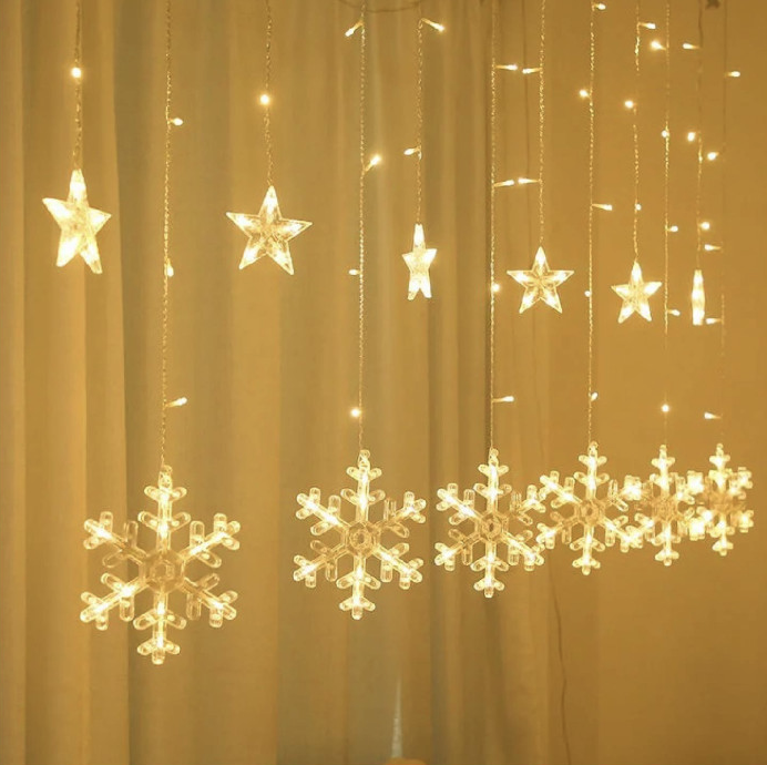 트리+루돌프+종+미니별, 달+큰별+미니별, 눈꽃+미니별, 큰별+미니별, 커튼식 LED 총 5가지 종류의 디자인으로 나온 대형 크리스마스 커튼식 줄조명. 가격 1만원대 후반.