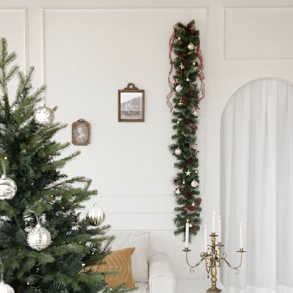 솔잎이 많고 솔방울과 빨간 열매가 듬뿍 들어 있어 풍성한 분위기를 연출할 수 있는 고급스러운 트리 가랜드. 가격 3만원대 초반.
