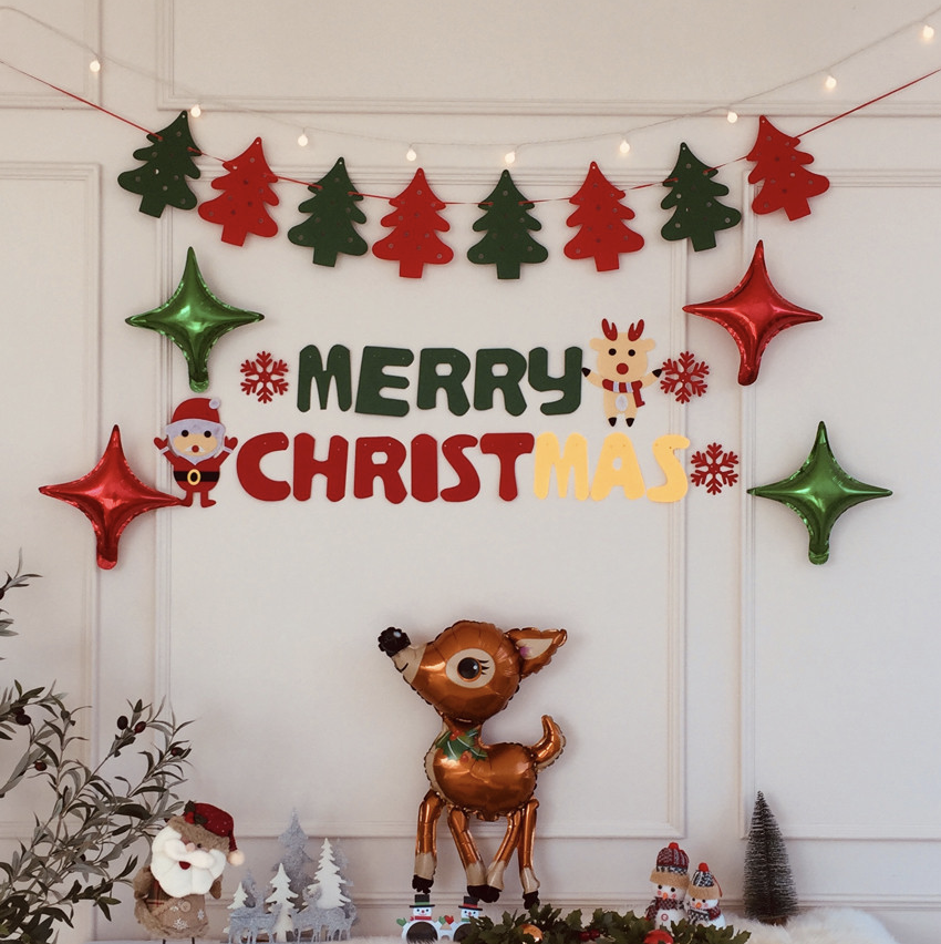 데코 트리 가랜드, 메리크리스마스 알파벳 가랜드, LED 앵두전구 2M, 은박별 10인치 레드 2P, 은박별 10인치 그린 10P, 루돌프 풍선으로 구성된 알차고 예쁜 가랜드 세트. 가격 8,800원.