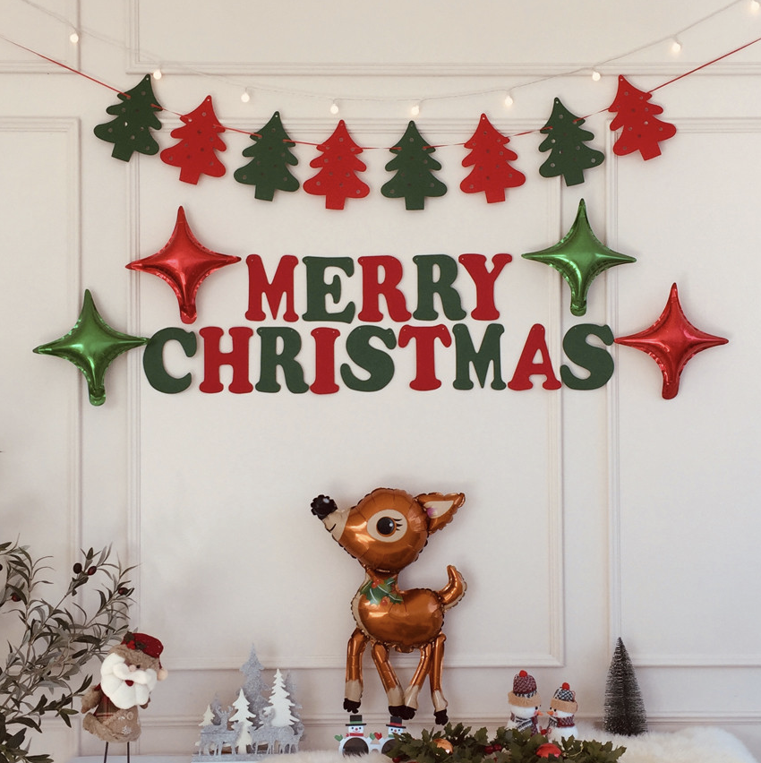 펠트 메리크리스마스 패턴삼각 가랜드부터 펠트 메리크리스마스 레터가랜드, 펠트 루돌프 썰매 가랜드, 펠트 크리스마스 패턴트리 가랜드까지 다양한 디자인으로 만나볼 수 있는 파티 가랜드. 가격 7,500원.