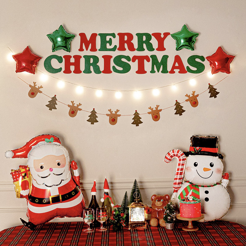 기본 메리크리스마스 레터링 가랜드뿐만 아니라 루돌프 트리 가랜드, 산타 풍선, 눈사람 풍선, 별풍선, 사탕풍선, 앵두알 앵두전구 20구까지 올인원으로 구성되어 있는 산타 눈사람 가랜드 세트. 가격 1만원대 초반.