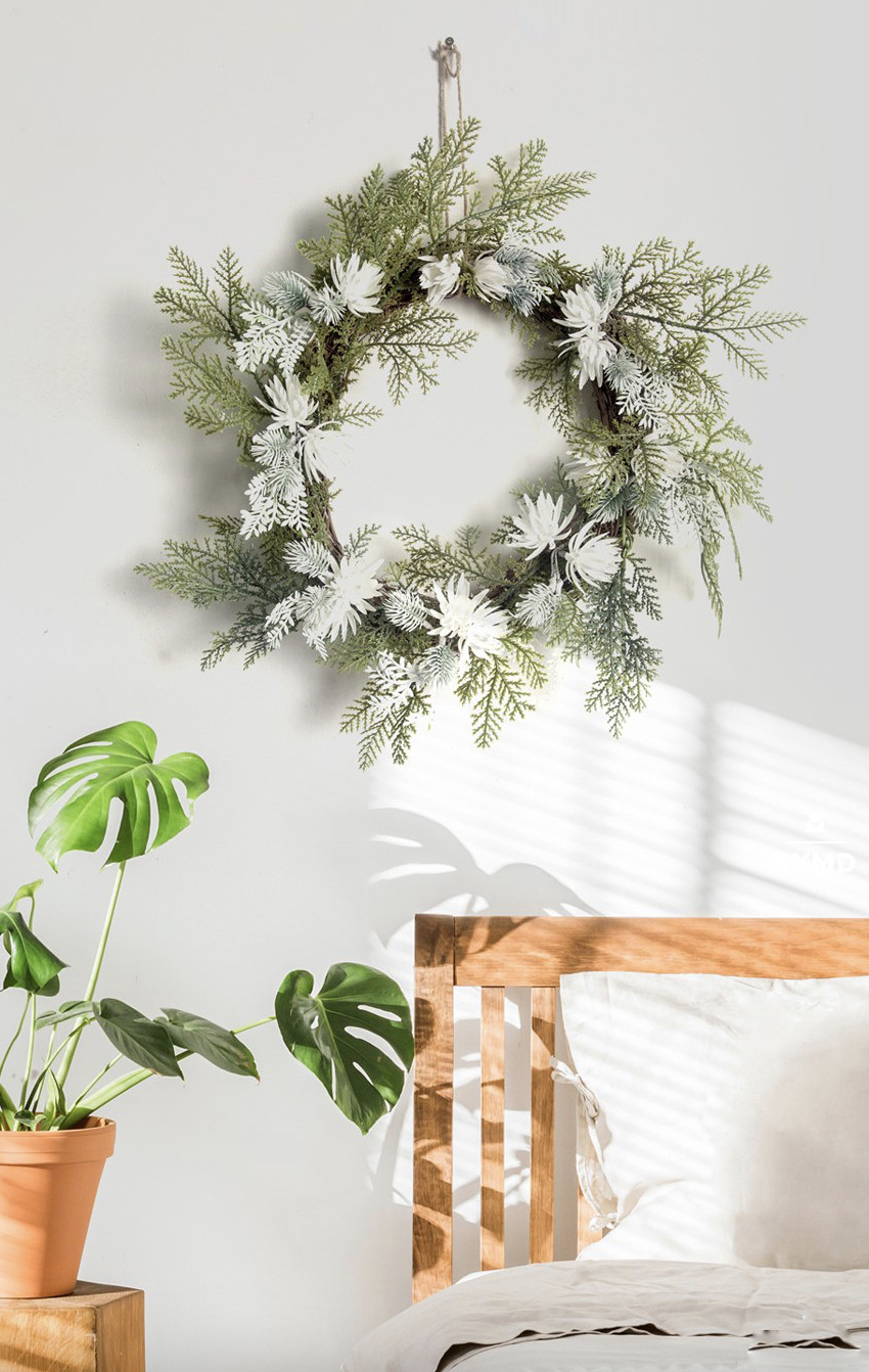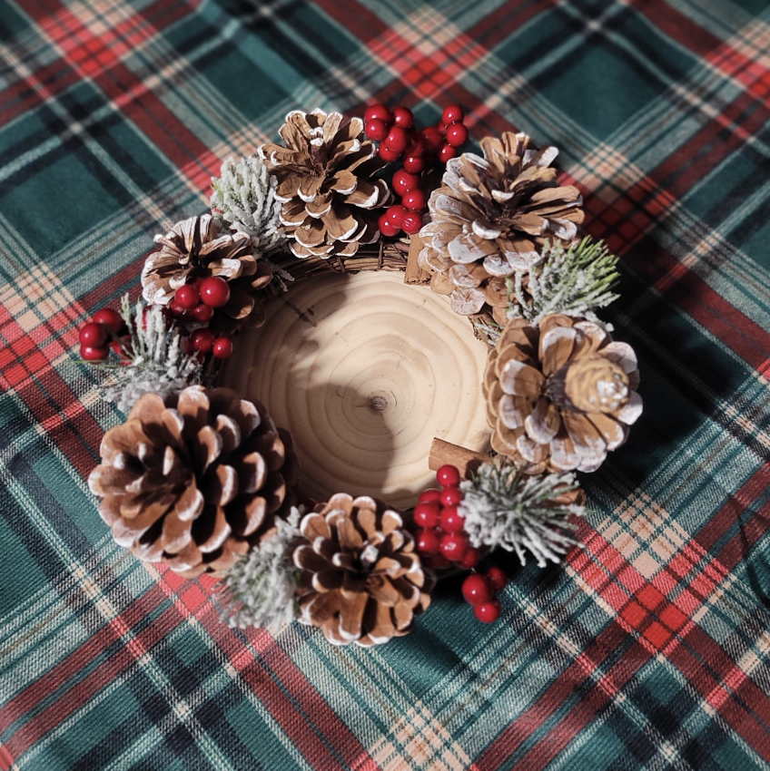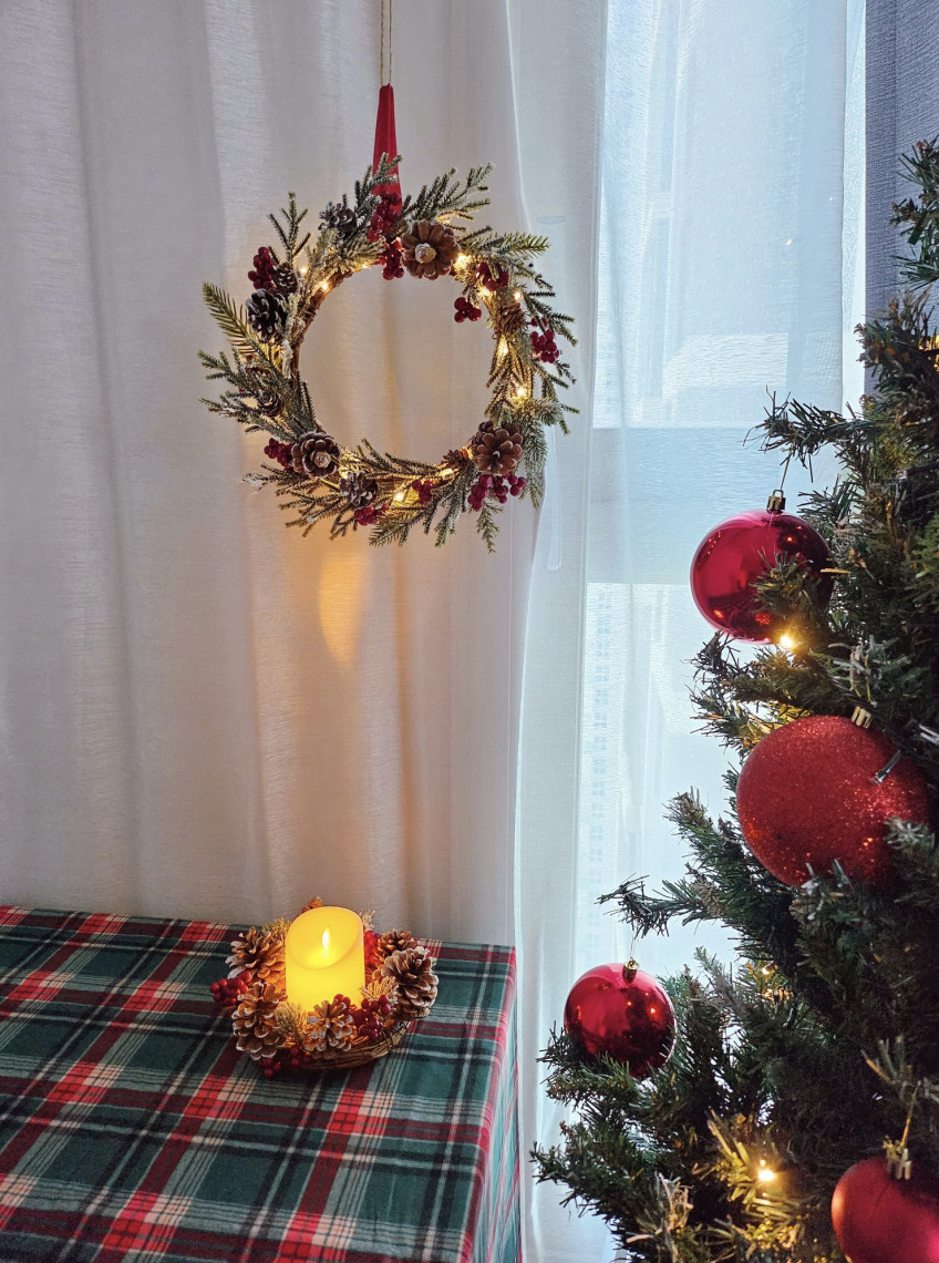 눈이 내린 솔방울과 부쉬로 장식된 클래식한 원형 디자인의 리스도 있고, 식탁이나 테이블에 그 하나만으로 크리스마스 느낌이 물씬 나는 캔들 리스도 만나볼 수 있다. 가격 28,000원.