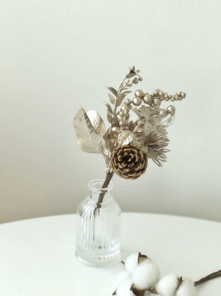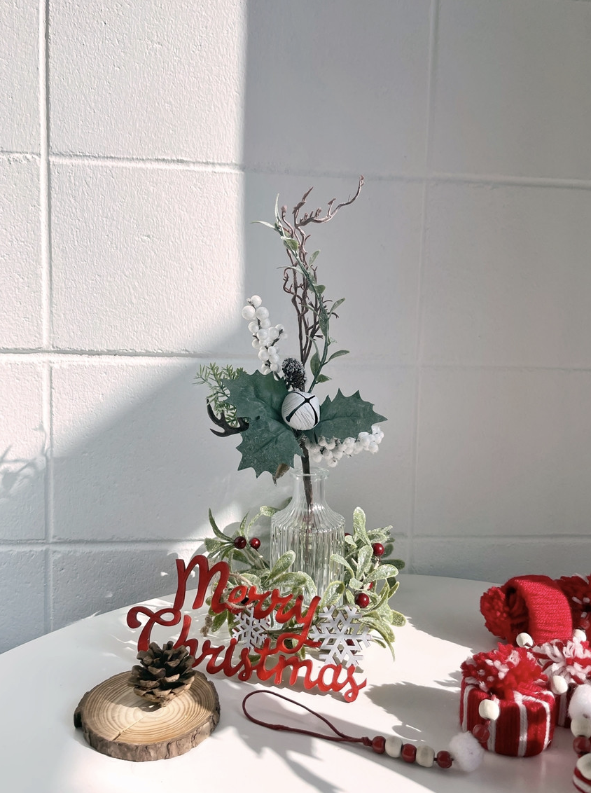 솔잎과 노무라잎 그리고 새빨간 망개 열매 등 한다발에 다양하게 조합이 되어 있는 솔베리부쉬 크리스마스 조화부터 고급스러운 벨벳 소재의 꽃잎과 생화처럼 제작된 꽃수술까지 디테일이 살아있는 포인세티아 포인트 소품, 첫눈처럼 새하얀 눈이 덮인 스노우 베리가지 조화까지 만나볼 수 있다. 가격 3,700원.