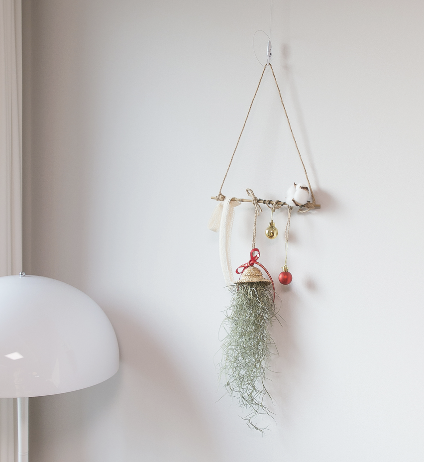커다란 트리가 부담스러울 때 가볍게 벽에 걸 수 있는 예쁜 행잉트리. 공기 정화 식물 수염틸란드시아가 매력적이다. 가격 13,900원.