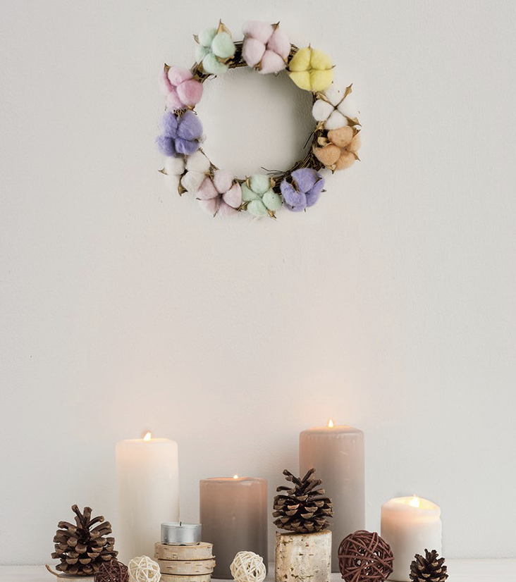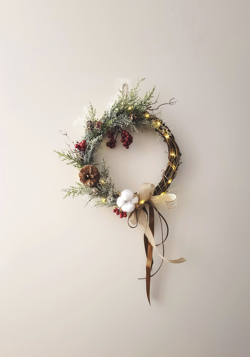 레드열매 포인트의 솔방울과 목화가 장식된 고급스럽고 깔끔한 느낌의 리스. 모든 제품이 수작업으로 제작되어 매력을 더한다.