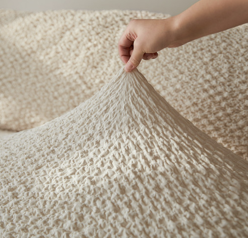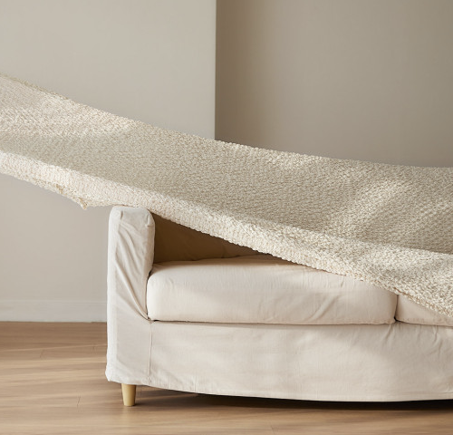 대량의 면혼방 원단으로 제작되어 수분 흡수 및 배출이 뛰어나 사계절 내내 쾌적하게 사용할 수 있다. 팝콘 모양의 링클 스판 소재로 2.8배나 늘어나는 경이적인 신축력이 굴곡진 쇼파커버에 맞춤 같은 핏을 연출할 수 있다.