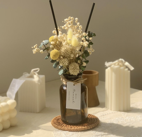생화를 수제 가공하여 만든 프리저브드 플라워를 장식함으로써 조화보다 더욱 자연스럽고 인테리어적 가치가 뛰어나다. 또한, 의료용 글래스 재질 용기와 마개를 사용하여 플라스틱 용기보다 고급스럽다. 가격 9,900원.