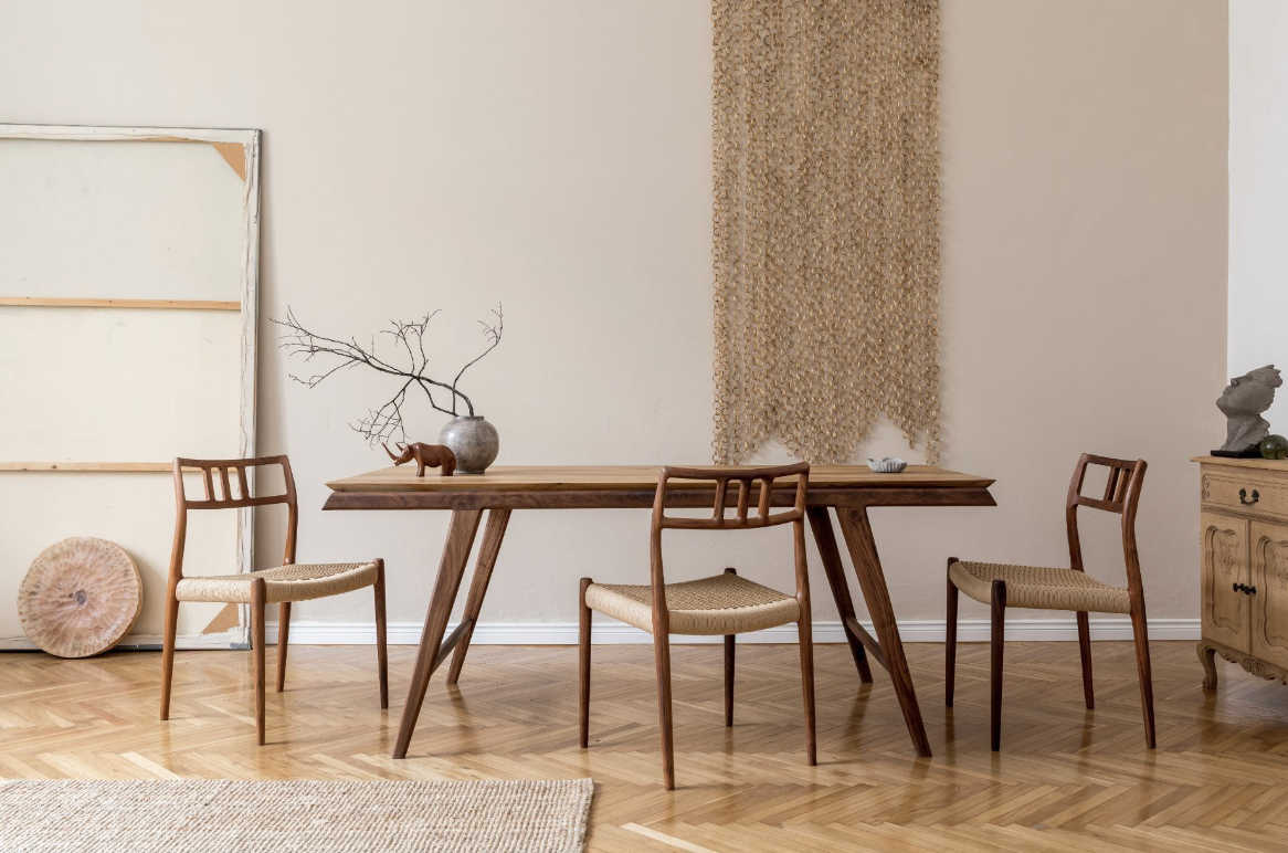곡선과 직선의 조화로움과 원목이 주는 따뜻한 색감을 느낄 수 있는 식탁.