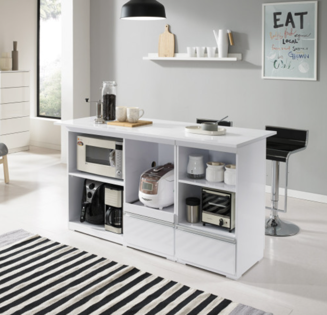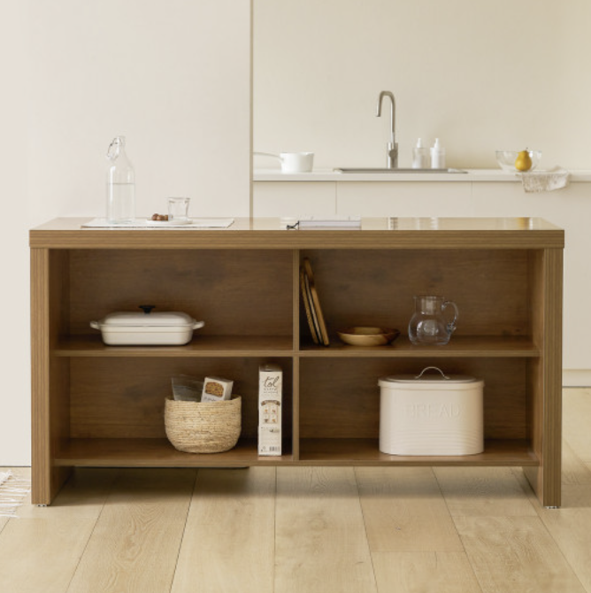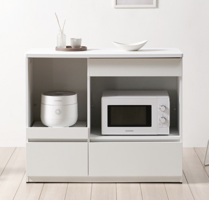 토스터기, 전기포트, 잘 사용하지 않는 가전, 반찬통 등을 수납하기 위해 2단 하부 수납장으로 수납력을 증가시키고, 선반은 빼둘 수 있어 다소 길거나 큰 술병, 장아찌나 과실주 병 등을 깔끔하게 보관할 수 있다. 가격 199,000원.