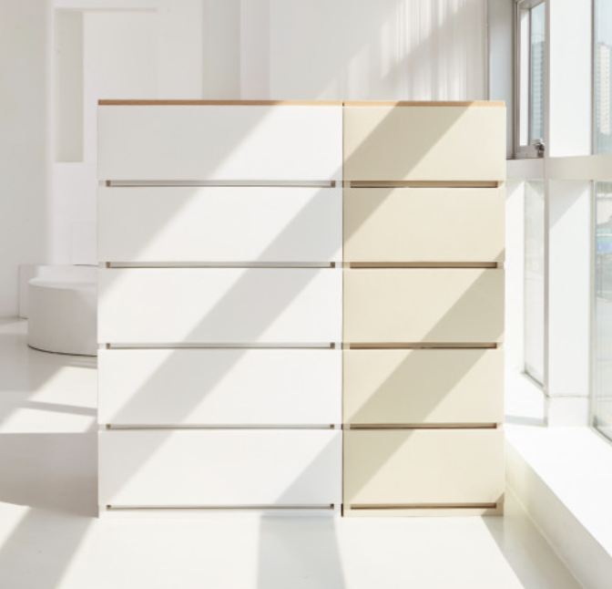 내구성 강화를 위해 알루미늄 바를 삽입했으며, 시중의 일반적인 서랍장보다 서랍 칸의 높이가 깊어 더 많이 수납할 수 있다. 가격 57,300원.