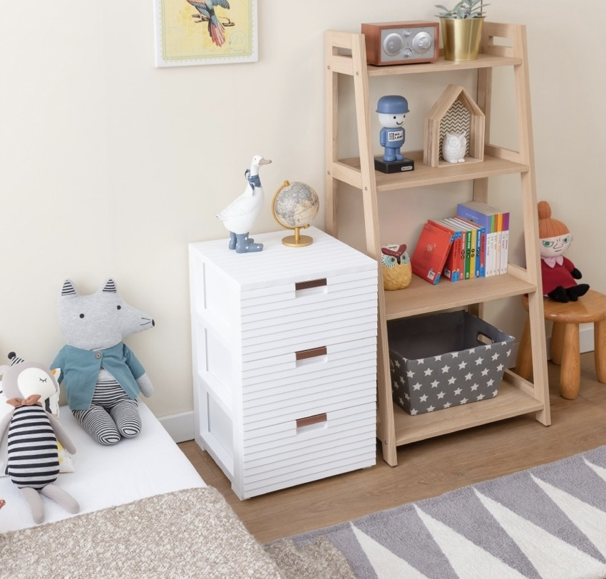 감성적인 베이지 우드 상판과 안이 보이지 않는 불투명 서랍부터 안이 투명한 서랍까지 다양하게 구성되어 있으며 납, 크롬, 수은, 카드뮴, 비소, 바륨, 세레늄, 안티몬 등 유해 물질들이 무첨가되어 더욱 안전하게 사용할 수 있다. 가격 24,900원.