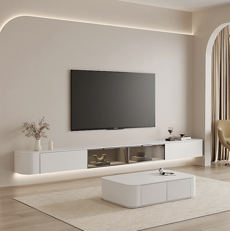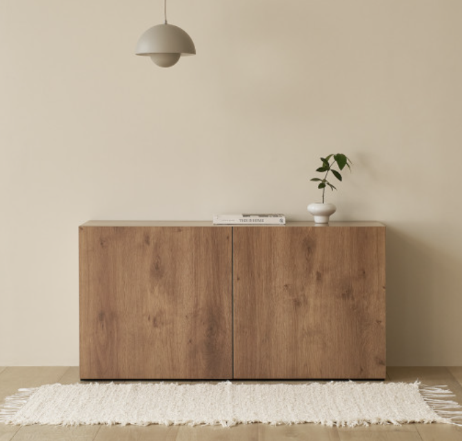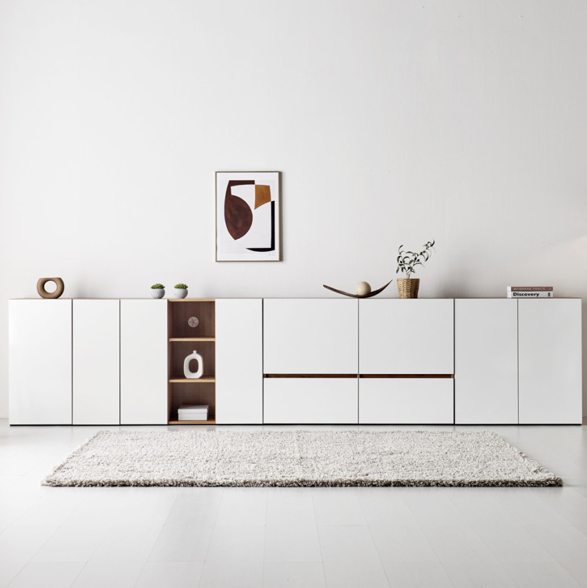 유해물질인 포름알데히드 방출량을 줄인 E0, E1 등급의 자재만을 사용한다. 안전한 매립형 손잡이를 사용하여 디자인과 실용성 모두 잡은 거실장.