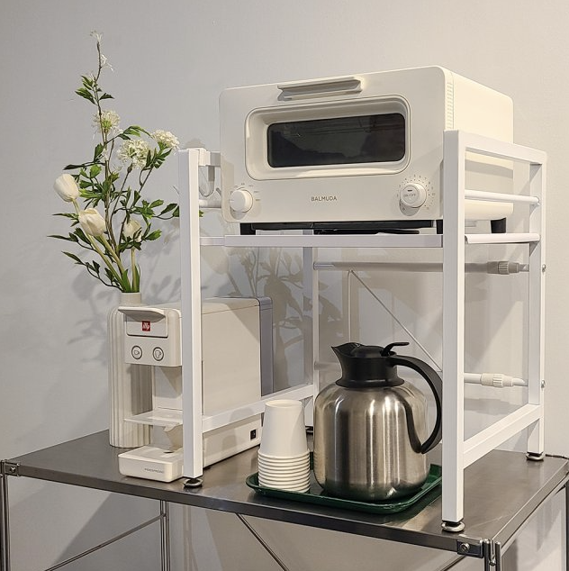 조립이 간단하고 가로 길이 조절도 간편하다. 철제 수납장이기에 열이 발생하는 에어프라이어를 올려놓고 사용하기에도 좋다. 가격 16,600원.