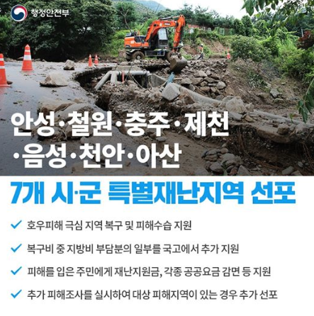 대한민국 행정안전부는 집중호우로 인해 안성, 철원, 충주, 제천, 음성, 천안, 아산 등 7개 시·군을 특별재난지역으로 선포하였다. 행정안전부는 피해시설 복구와 피해주민 생활안전 지원에 최선을 다하겠다고 밝혔다.