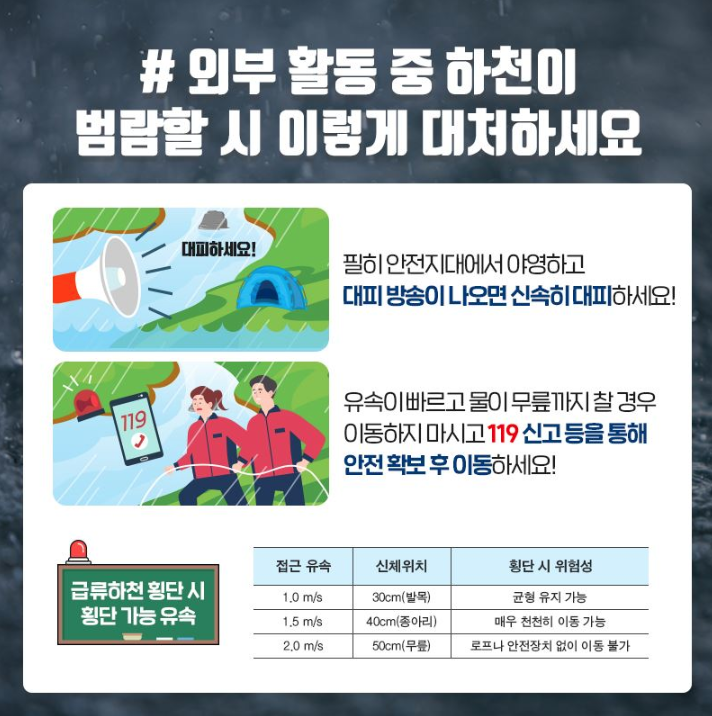 둘째, 외부 활동 중 하천이 범람할 시에는 다음과 같이 대처하라. 필히 안전지대에서 야영하고 대피 방송이 나오면 신속히 대피해야 한다. 유속이 빠르고 물이 무릎까지 찰 경우 이동하지 말고 119 신고 등을 통해 안전 확보 후 이동해야 한다.