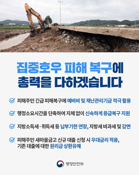 행정안전부는 집중호우 피해 복구에 총력을 다하겠다고 밝혔다. 지방자치단체의 예비비 및 재난관리기금을 적극 활용하고, 행정소요시간을 단축해 지체 없이 신속하게 복구할 수 있도록 지원할 예정이다. 피해 주민들을 대상으로는 지방세 감면 등 세제 지원을 시행할 계획이다.