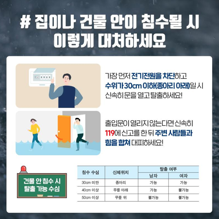 셋째, 집이나 건물 안이 침수될 시 다음과 같이 대처해야 한다. 가장 먼저 전기전원을 차단하고 수위가 30cm 이하(종아리 아래)일 시 신속히 문을 열고 탈출해야 한다. 출입문이 열리지 않는다면 신속히 119에 신고를 한 뒤 주변 사람들과 힘을 합쳐 대피해야 한다.