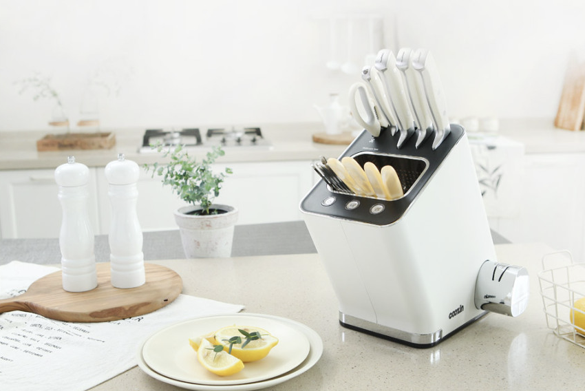 화학 작용 없이 UVC 램프의 파장으로 바이러스 DNA를 분열시켜 세균을 99.9% 소독한다. 살균 건조가 가능한 PTC 열풍 건조 시스템으로 내부 온도를 약 40도까지 유지시켜 잔여 물기를 제거해줌과 동시에 한번 더 살균해준다. 다이아몬드 세라믹 코팅 칼갈이의 전동 샤프닝 기능으로 칼날의 좌우를 개별적으로 연마할 수 있다. 다양한 크기의 수납 공간이 있어 중식도를 포함하여 최대 4개의 다양한 칼과 가위, 수저를 거치 및 살균할 수 있다. 가격 69,800원.