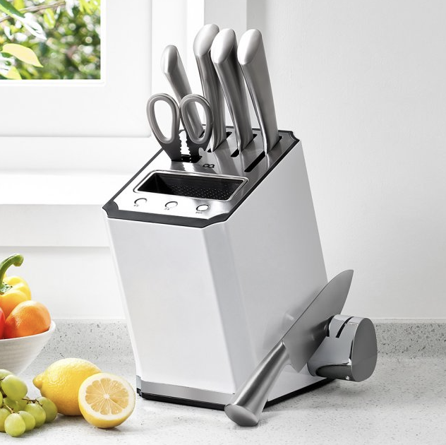 나이프케어에 꽂아 놓기만 해도 UV자외선 살균 기술로 대장균, 녹농균, 황색포도상구균, 폐렴균 4대 생활균 99.9% 살균! 살균과 동시에 PTC 스마트 열풍건조로 남아있는 물기까지 완벽하게 제거한다. 물받이 트레이가 있어 간편하게 물기 제거가 가능하고, 안전하고 오래가는 스테인리스 304 소재를 사용하였으며, 다이아몬드 전동 칼갈이 기능으로 연마제나 윤활유 없이도 좌우 자동연마 방식으로 지나가기만 해도 1초 만에 칼을 갈아준다. 가격 159,000원.