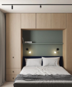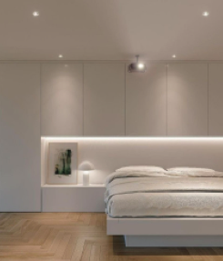 침대장의 은은한 간접 조명으로 무드 있는 방이 완성되었다. 디테일하고 고급스러운 안방 인테리어를 원하시는 분들께 추천한다. 저희 블룸에서는 고객님들의 취향에 따라 다양한 디자인으로 세상에 단 하나밖에 없는 붙박이장을 만들 수 있다.