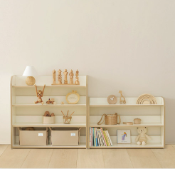 수납공간이 있는 낮은 책진열대가 있으면 아이가 책과 장난감을 스스로 넣고 꺼낼 수 있다. 책의 앞 페이지가 잘 보인다면 책 읽기를 좋아하는 많은 아이들이 좋아하는 책을 더 쉽고 빠르게 찾을 수 있을 것이다.