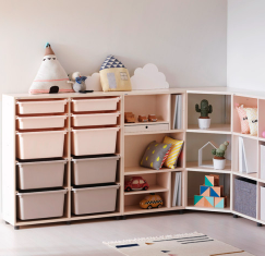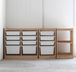 프레임에 홈이 파여있어서 원하는 대로 수납함과 선반을 설치할 수 있고 언제든지 위치를 바꿀 수도 있다. 수납장이 낮아서 아이들 스스로 물건을 꺼내고 정리할 수 있다.