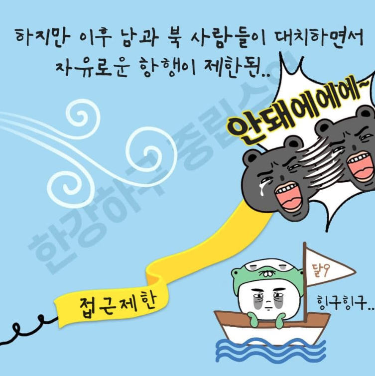 하지만 이후 남과 북 사람들이 대치하면서 자유로운 항행이 제한되었다. 그래서 북한에서 떠내려왔던 평화의 소도 유도에 갇혀 나올 수가 없었던 것이다.