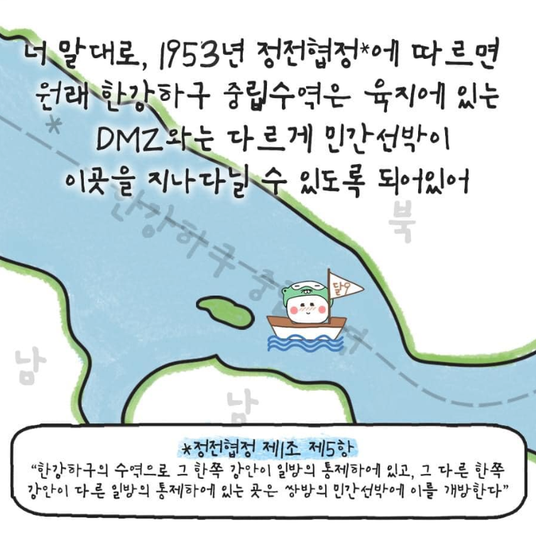 1953년 정전협정에 따르면 원래 한강하구 중립수역은 육지에 있는 DMZ와는 다르게 민간선박이 이곳을 지나다닐 수 있도록 되어 있다. 정전협정 제1조 제5항에 따르면 “한강하구의 수역으로 그 한쪽 강안이 일방의 통제하에 있고, 그 다른 한쪽 강안이 다른 일방의 통제하에 있는 곳은 쌍방의 민간 선박에 이를 개방한다.”