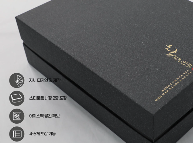 예쁜 선물세트 기프트 박스 상자 포장 답례품 제품 추천 다섯 번째, 찐텐마켓 정육 선물 포장 보냉 지함 박스 참좋은인연4호 제품은 페브릭 패턴의 고급용지를 사용하였으며, 금박으로 포인트를 주어 받는 분에게도 만족스러움을 더한다. 자체 디자인 및 제작, 스티로폼 내장 2층 포장, 아이스팩 공간 확보, 4-6개 포장 가능한 것이 특징이다.
