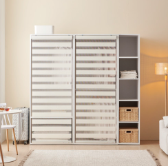 작은집 드레스룸, 블라인드를 내리면 공간이 깔끔해 손님방 등 멀티공간으로 사용하기 좋다. 효율적인 침실 옷장, 옷장 문이 없어서 공간이 절약되어 침대 옆에 최소공간만 있어도 연출 가능하다. 아이방에 편안한 분위기 연출, 이미지 블라인드로 아이방을 아늑하게 만들어준다.