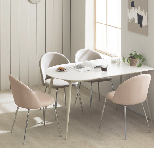 미드센추리 클로에 화이트 반타원 반원 테이블 식탁 2size 1000/1200은 수려한 라인의 곡선 프레임으로 군더더기 없는 디자인을 적용하였고, 아늑한 무드의 오프화이트 컬러 상판과 세련된 실버 스틸다리의 조합을 선보입니다. 실버 사선형 다릿발은 와이어 브릿지로 다리를 견고하게 잡아주며, 3개의 파이프로 상판을 지탱하는 구조로 튼튼하고 흔들림에 강합니다.