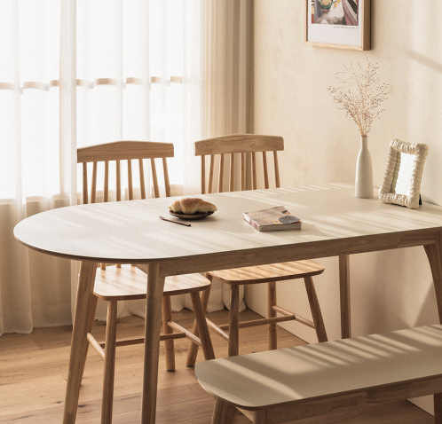 레트로하우스 크리미 화이트식탁 원목 식탁테이블 반타원 테이블 1200은 어떤 공간이든 잘 어울리는 내추럴 화이트 식탁으로 밝고 화사한 공간을 만들어주며, 자작나무 원목에 HPM 표면마감을 하여 생활 스크래치, 뜨거운 냄비, 김치나 카레 흘림 등 화이트 식탁의 관리 걱정을 줄여줍니다. 가공된 MDF가 아닌 고무나무 천연 원목 프레임으로 안정감 있고 견고하게 사용할 수 있습니다.