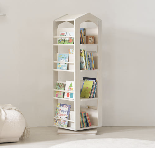 슬로우알레 머핀 회전책장은 우리집 화이트 인테리어에 잘 어울리도록 심플한 디자인으로 완성했으며 아이들의 많은 책들을 한 번에 정리하고 필요할 때는 앞면으로 돌려 깔끔한 인테리어를 연출할 수 있습니다. 폭 50cm로 양면에 책을 꽂을 수 있어 수납력이 좋고 한눈에 들어오는 높이와 회전기능으로 아이들이 골고루 책을 읽을 수 있습니다.