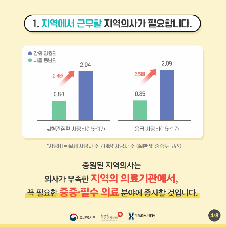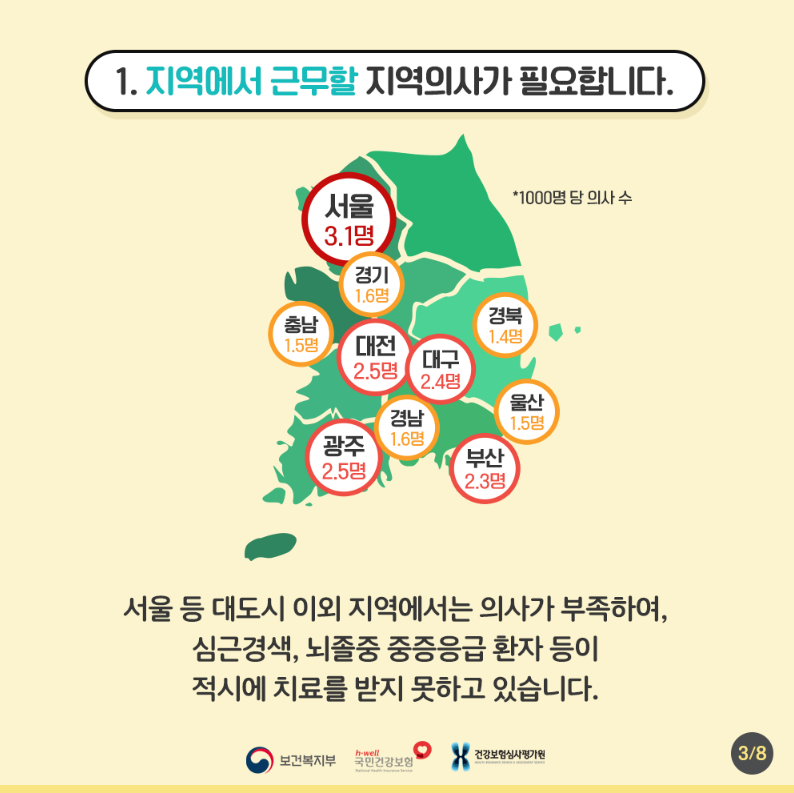 이에 지방 병원에서는 의사가 부족해 병원 운영이 어렵다는 의견이 지속 제기돼왔다. 의사가 부족한 지역에 사는 환자는 적시에 양질의 의료서비스를 이용하기 어렵다. 뇌졸중·응급질환이 생겼을 때, 이를 신속히 치료할 수 있는 의사가 없어 안타깝게 돌아가시게 되는 사례를 방지해야 할 필요가 있다.