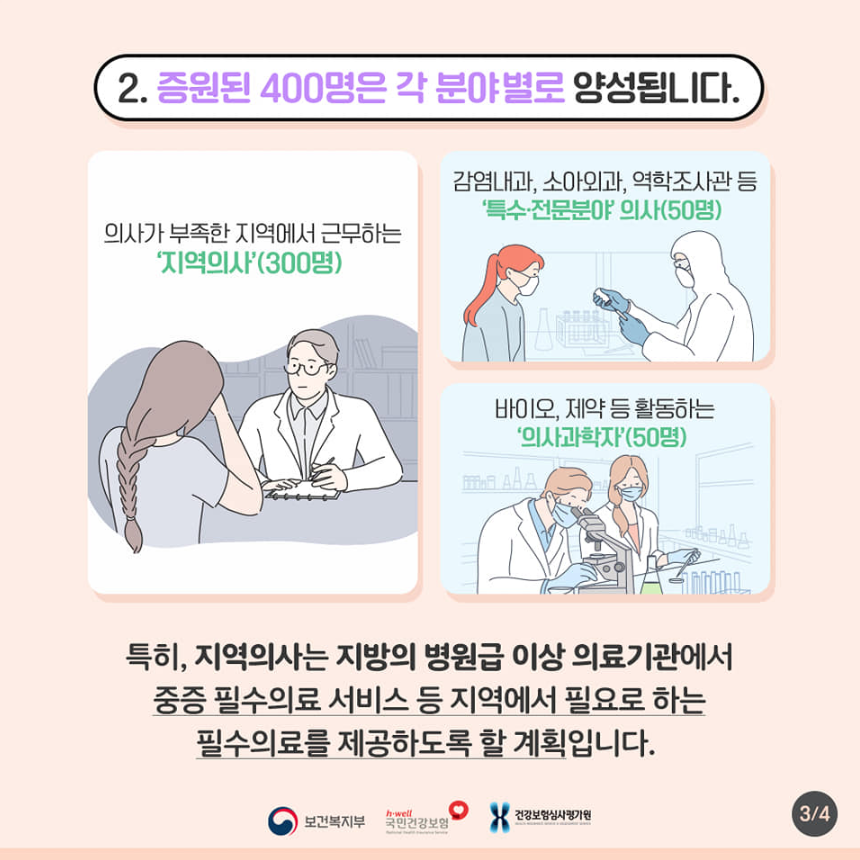 현재 의대 정원은 3058명으로 2022년에는 최대 400명을 확대하여 10년 동안 한시적으로 최대 3458명을 유지한다. 2032년이 되면 다시 원래 수준인 3058명으로 감축한다. 400명중 300명은 지역에서 근무하는 '지역의사'로 양성한다. 지역의사는 의사가 부족한 지역의 병원급 이상 의료기관으로 배치해 중증 필수의료 서비스 등 지역에서 필요로 하는 필수의료를 제공하도록 할 계획이다. 또 50명은 감염내과, 소아외과, 역학조사관 등 특수·전문분야 의사로 양성하고 나머지 50명은 의사과학자로서 바이오, 제약, 의료기기 등 다양한 분야에서 활동할 수 있도록 추진한다.