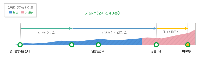 - 구간: 삼가탐방지원센터 → 달밭골입구 → 양반바위 → 비로봉