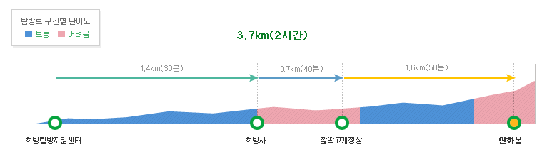 - 구간: 희방탐방지원센터 → 희방사 → 깔딱고개정상 → 연화봉