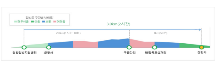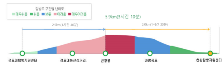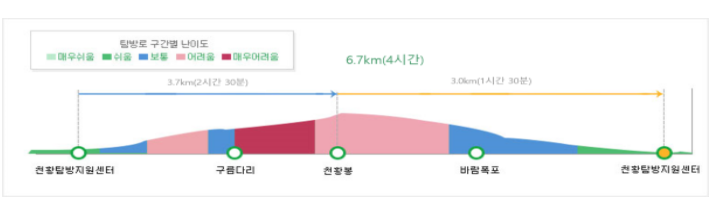 - 구간: 천황탐방지원센터 → 구름다리 → 천황봉 → 바람폭포 → 천황탐방지원센터