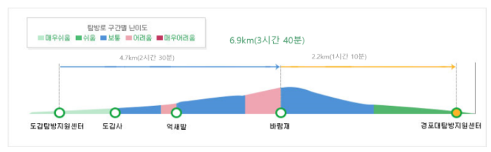 - 구간: 도갑탐방지원센터 → 도갑사 → 억새밭 → 바람재 → 경포대탐방지원센터