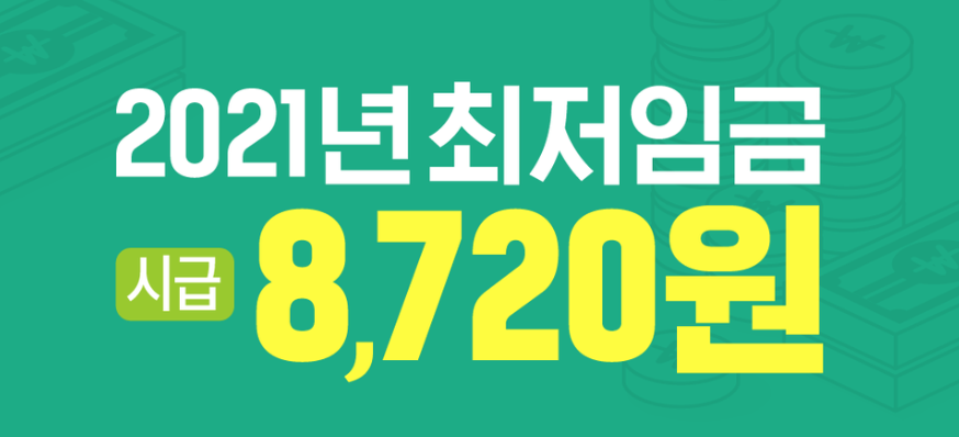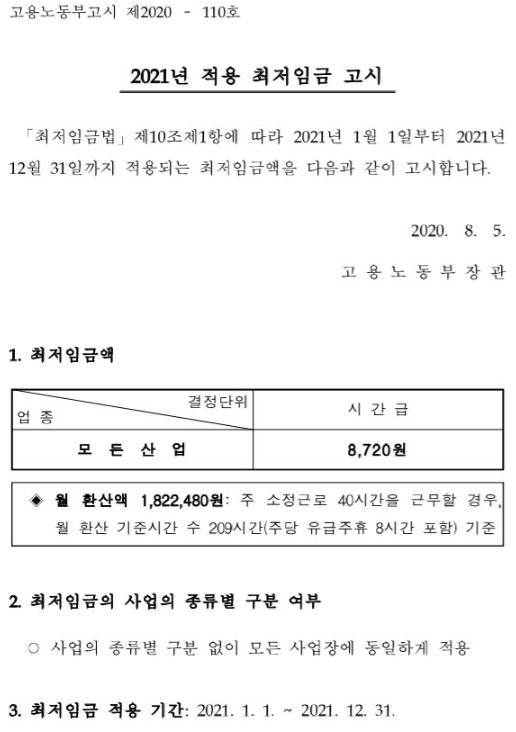 2021년 최저임금이 시간당 8720원으로 최종 확정됐다. 5일 고용노동부는 “‘최저임금법’ 제10조 제1항에 따라 2021년 1월 1일부터 2021년 12월 31일까지 적용되는 최저임금액을 고시한다”고 밝혔다. 고용노동부는 2021년도 적용 최저임금을 시간급 8,720원(최저시급, 인상률 1.5%, 증 130원)으로 8월 5일(수) 고시하였다.