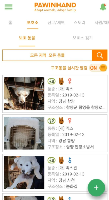 유기견 무료분양 방법 두 번째! 포인핸드 어플을 활용하여 유기견을 무료로 분양을 받아보려면 우선 스마트폰에다가 포인핸드 앱을 다운로드해서 설치해주도록 한다. 포인핸드 앱을 실행한 다음 화면의 상단을 보면 [보호소] 메뉴가 있다. [보호소]를 선택해주면 지역과 기간 그리고 동물의 종류를 본인이 원하는 대로 설정해볼 수 있다. 분양하기를 원하는 견종이 있는 경우엔 해당 견종을 선택해서 검색해볼 수도 있다. 거주하는 지역 위주로 살펴보는 것이 유기견을 분양받는 데 가장 편리하다. [보호중인 동물만 검색] 선택란에 체크를해주면 유기견 정보가 나온다.