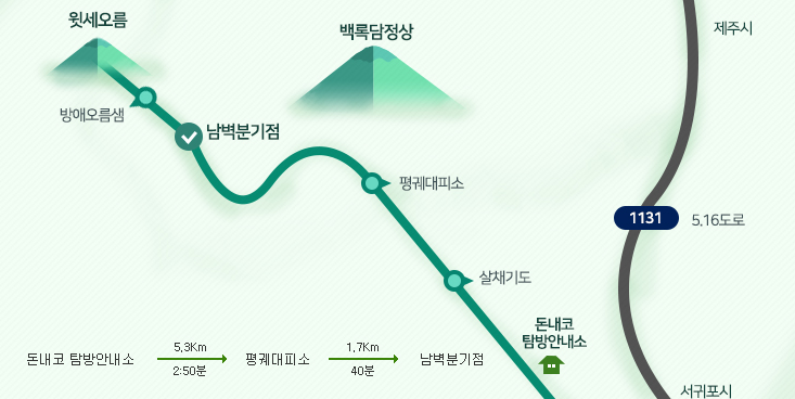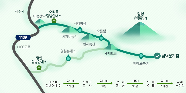 - 구간: 어리목탐방안내소 → 사제비동산 → 만세동산 → 윗세오름 → 남벽분기점