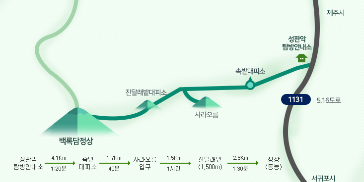 - 구간: 성판악탐방안내소 → 속밭대피소 → 사라오름입구 → 진달래밭 → 동능