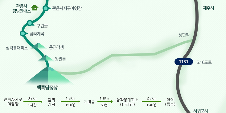 - 구간: 관음사지구야영장 → 탐라계곡 → 개미등 → 삼각봉대피소 → 동능
