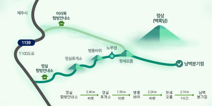 - 구간: 영실탐방안내소 → 영실휴게소 → 병풍바위 → 윗세오름 → 남벽분기점