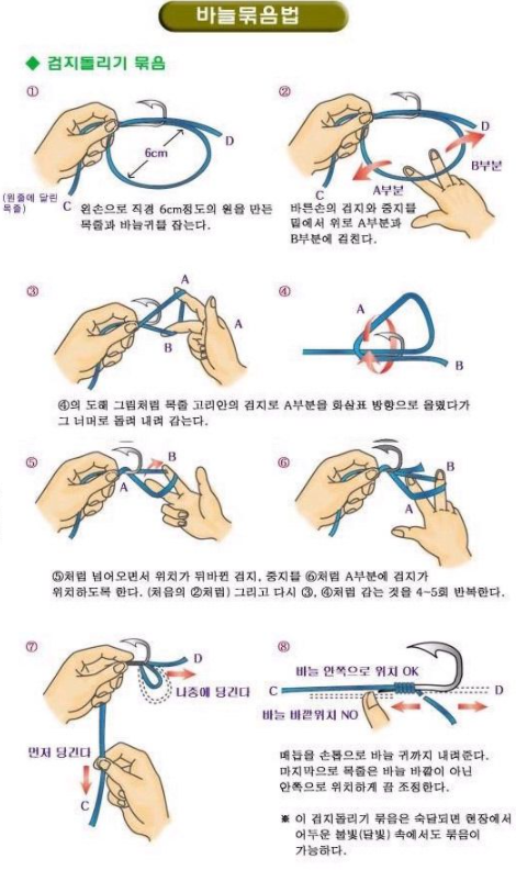 세상에는 수많은 매듭법이 존재한다. 누군가는 대략 3천여 가지 이상이라 말하지만 살짝의 응용으로도 새로운 이름의 매듭법이 탄생을 하고 있어서 그 경우의 수는 실상 무한대라고 할 수 있다. 오늘 소개하는 매듭법은 현존하는 매듭법 가운데 최고의 매듭법은 아닐 수 있으나 조금이나마 낚시를 하는 데 보탬이 되기를 바란다. 낚시바늘 묶는 방법 5가지는 아래와 같다.