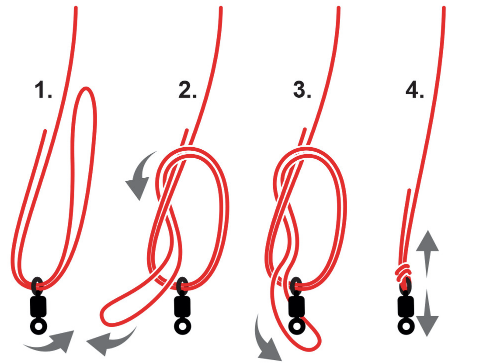 낚시바늘 묶는 방법 첫 번째! 우선 지름 5~6cm의 원이 생기게끔 고리를 만들어준다. 그후 매듭이 교차하는 지점에 바늘을 붙여준다. 목줄의 고리 부분으로 목줄의 끝부분을 감아준다. 감을 때의 방향은 앞쪽으로 나아가게끔 5~8회 감아준다. 목줄의 끝 부분을 당겨주도록 한다. 이때, 목줄의 끝부분이 짧으므로 가급적이면 도구를 사용해서 강하게 당겨주는 것이 좋다. 목줄과 바늘을 반대방향으로 당겨주도록 한다.