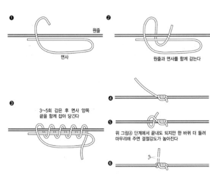 낚시바늘 묶는 방법 네 번째! 릴 찌낚시에서 반드시 알아 두어야 하는 면사 매듭법이다. 초보자들이 면사매듭을 구입할 때 미리 묶여져 있는 것을 사고는 하는데, 물론 편리하긴 하나 가격 대비 좋지 않다.